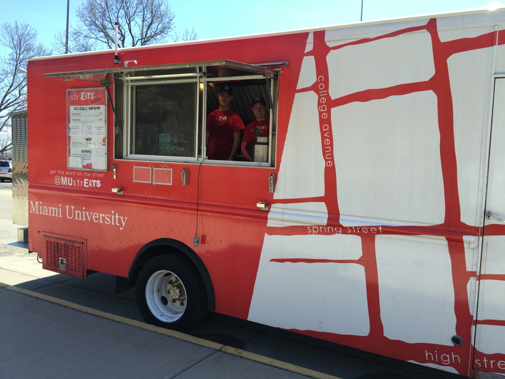 Wrapped in red and white map of Miami University’s campus, StrEATS, the food truck is easily spotted around the campus. Along with its unique menus and style of service to the university, it holds a small community in itself. The customers seem to enjoy as they make it a daily routine to get their meals from StrEATS and the employees respond by providing good customer service while making personal connections with them.